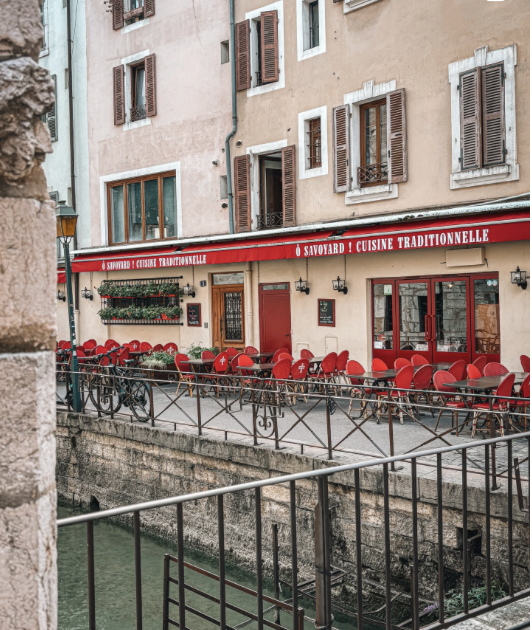 Installé dans un décor boisé typique, le restaurant met à l'honneur les spécialités régionales et les produits locaux issus de producteurs savoyards. La salle, lambrissée de bois, crée une ambiance conviviale et montagnarde, tandis que la terrasse offre une vue privilégiée sur le canal et les ruelles de la vieille ville. La carte met en avant les grands classiques de la gastronomie savoyarde: fondue savoyarde, raclette (selon la saison), tartiflette au fromage de Tamié, diots et spécialités locales, poissons des lacs alpins, salades, planches à partager...